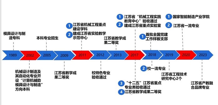 本專業創辦于1989年,經過近30多年的建設,材料成型及控制工程專業得到了良好的發展,2009年專業所屬學科——材料加工工程學科獲批校級重點建設學科,同年獲批校級特色專業,2012年獲批江蘇省“十二五”重點建設專業類(機械類),2018年獲批校一流專業,2020年獲批江蘇省一流本科專業建設點,2023年獲批江蘇省産教融合品牌專業。