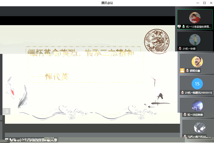 觀看結束後,同學們深受啟發,雖然因為疫情原因不能為革命先烈們祭掃,但他們都以線上發言的形式表達了自己對于革命先烈們的緬懷。副班長周宇倩由衷感慨,作為新一代的大學生,國家的棟梁,我們有義務,有責任繼承并發揚革命先輩的崇高精神,把他們的崇高精神轉化為開創美好未來的強大動力。宋昱霖慷慨激昂,他談到,革命先烈們的遺志我們一定銘記,他們為之流血犧牲的偉大理想我們永志不忘,傳承紅色基因,赓續精神血脈,不忘初心、繼續前進,努力創造無愧于時代、無愧于人民、無愧于先輩的新的業績;張戎棪深有感觸,恽代英是中國共産黨先輩們的縮影,他們是中國革命的先驅,他們培養和影響了整整一代青年,他們永遠成為中國青年的楷模;王祎凡表示我們應該珍惜現在的美好生活,在革命先烈們用鮮血、用生命鋪成的道路上繼續前行,用我們的才智去實現先烈們未盡的事業,用我們的知識和力量努力建設社會主義現代化國家。