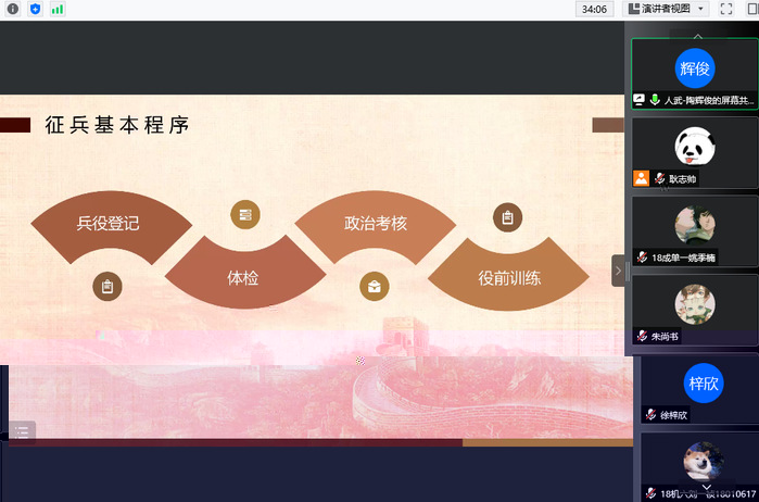 陶輝俊為2022屆應屆畢業生做了參軍入伍主題宣講。陶輝俊詳細講解了一年兩次征兵的相關政策及要求,大學生征兵入伍的相關優惠政策;對兵役登記、體檢、政治考核與役前訓練等有關事項做了提醒,并積極鼓勵符合條件以及有入伍意願的同學積極響應國家的号召,攜筆從戎,報效祖國。在動員大會後,陶輝俊還熱情解答了與會同學的提問。