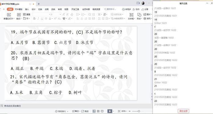 21成型一的同學們首先自行制作香囊,之後通過騰訊會議,對同學們的香囊成品進行展示,并開展了線上端午節知識趣味競賽,旨在增加同學們對端午知識的了解,加深同學們對于端午節這一中華民族傳統節日的認識。