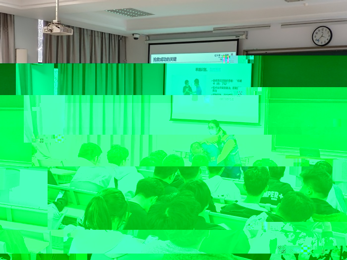 培訓中,主講教師通過多媒體展示,向在場同學講授急救技能和踩踏、癫痫、腳扭傷、中暑等突發事件的避險與急救。培訓現場,采取急救理論與操作演示相結合的方式,講解了心肺複蘇術、海姆立克急救法等急救知識和技能,并利用模拟人演示具體操作方法和動作技巧。同學們在老師的指導下依次進行了實際操作,老師對“搶救”過程逐人把關、點評。