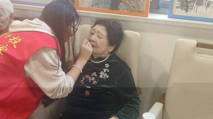 活動伊始,女同學們為參加表演的奶奶們做妝造。她們輕輕攙扶着奶奶們坐下,從打底到畫眉,從塗抹腮紅到塗抹口紅,每一個步驟都傾注着耐心與關愛。在同學們的巧手下,奶奶們原本慈祥的面容更添了幾分光彩,笑容也越發燦爛。随後便是精彩的服裝展示環節。爺爺奶奶們在同學們的幫助下換上了精美的旗袍和充滿特色的民族服裝。爺爺們身姿挺拔,奶奶們優雅端莊,他們邁着穩健的步伐依次走過“T台”,現場掌聲、歡笑聲不斷。有的老人還擺起了姿勢,那自信的模樣仿佛回到了年輕時光。歲月的車轍在他們的臉上留下了深深的痕迹,無法抹平的皺紋、下垂的眼袋、松垮的皮膚都在叫嚣着歲月這把“殺豬刀”的厲害,但是歲月從不敗美人,那樣一顆積極開朗的心足以讓他們在時間的長河裡屹立不倒。
