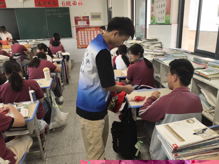 活動當天,志願者們精心準備了寓意“高中(zhòng)”的“高粽”禮袋,每份禮袋附有“乘風破浪”“芒種深耕,金榜題名”等勵志貼紙,既傳承端午食俗,又巧妙融合芒種時節的耕耘精神,鼓勵初三學子奮勇拼搏,傳遞對他們的鼓勵與支持。