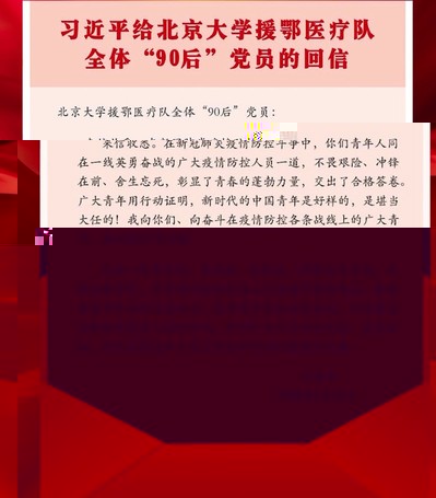 在這次抗擊疫情的鬥争中,以“90後”為代表的青年一代挺身而出、擔當奉獻,充分展現了新時代中國青年的精神風貌。近日,北京大學援鄂醫療隊的3490黨員給習近平總書記寫信,彙報了在抗疫一線搶救生命的情況,表達了繼續發揮黨員作用、為打赢疫情防控阻擊戰貢獻力量的決心。中共中央總書記、國家主席、中央軍委主席習近平315給北京大學援鄂醫療隊全體90黨員回信,向他們和奮鬥在疫情防控各條戰線上的廣大青年緻以誠摯的問候。