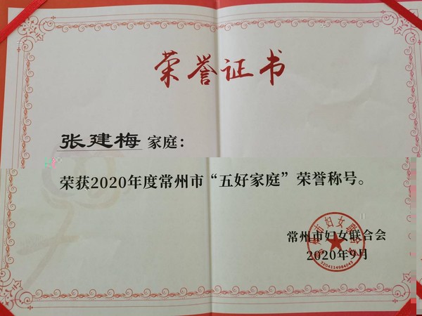 我支部張建梅教授家庭獲2020年度“常州市五好家庭”榮譽稱号